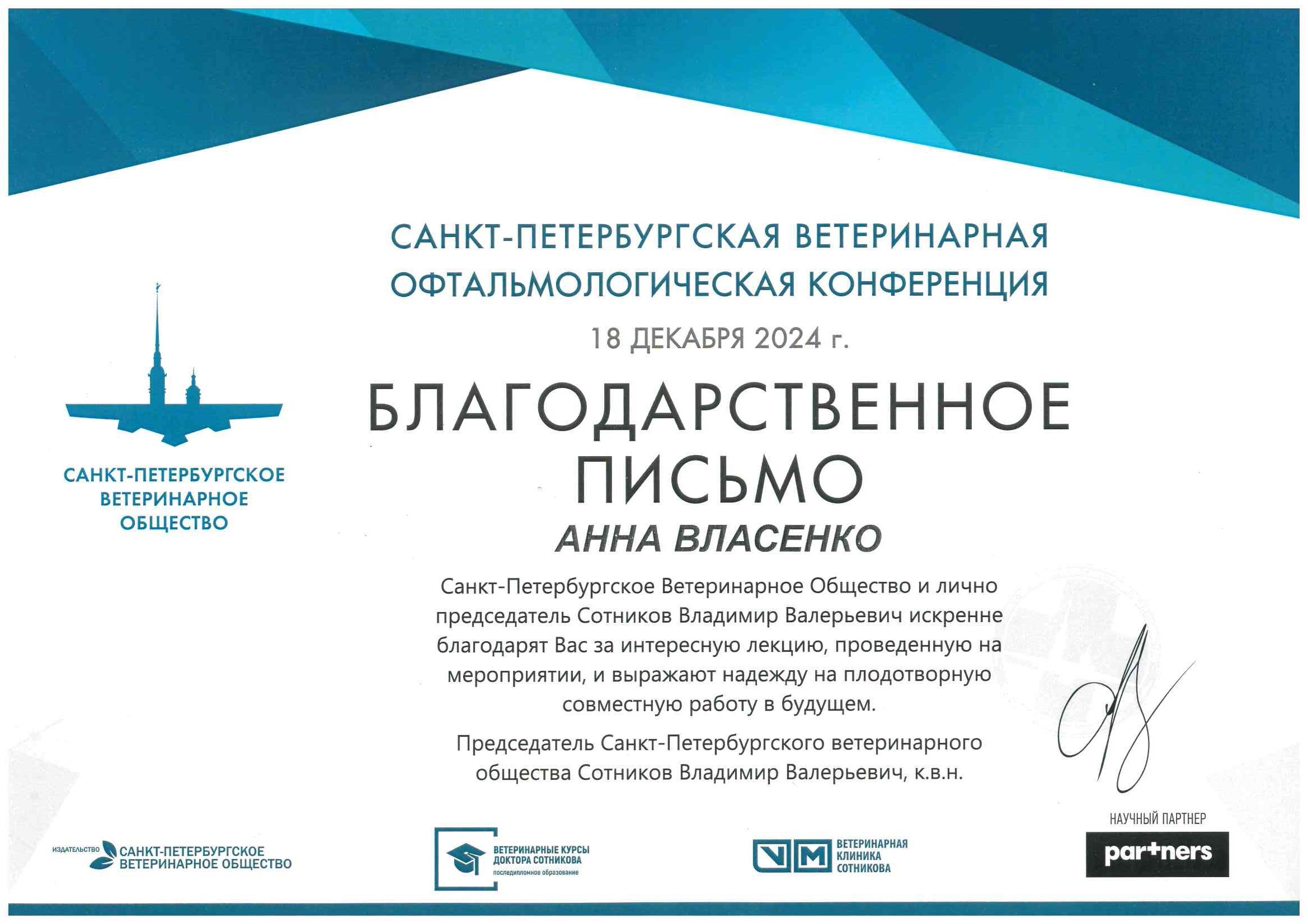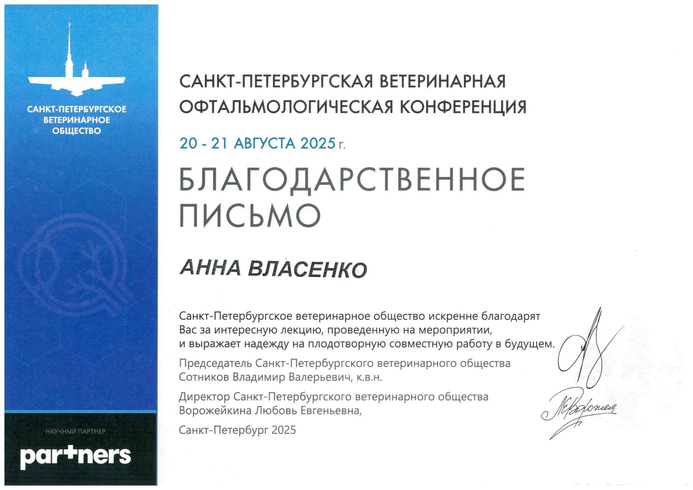 Лектор Санкт-Петербургской ветеринарной офтальмологической конференции, СПбВО, СПб, 2024 и 2025 год