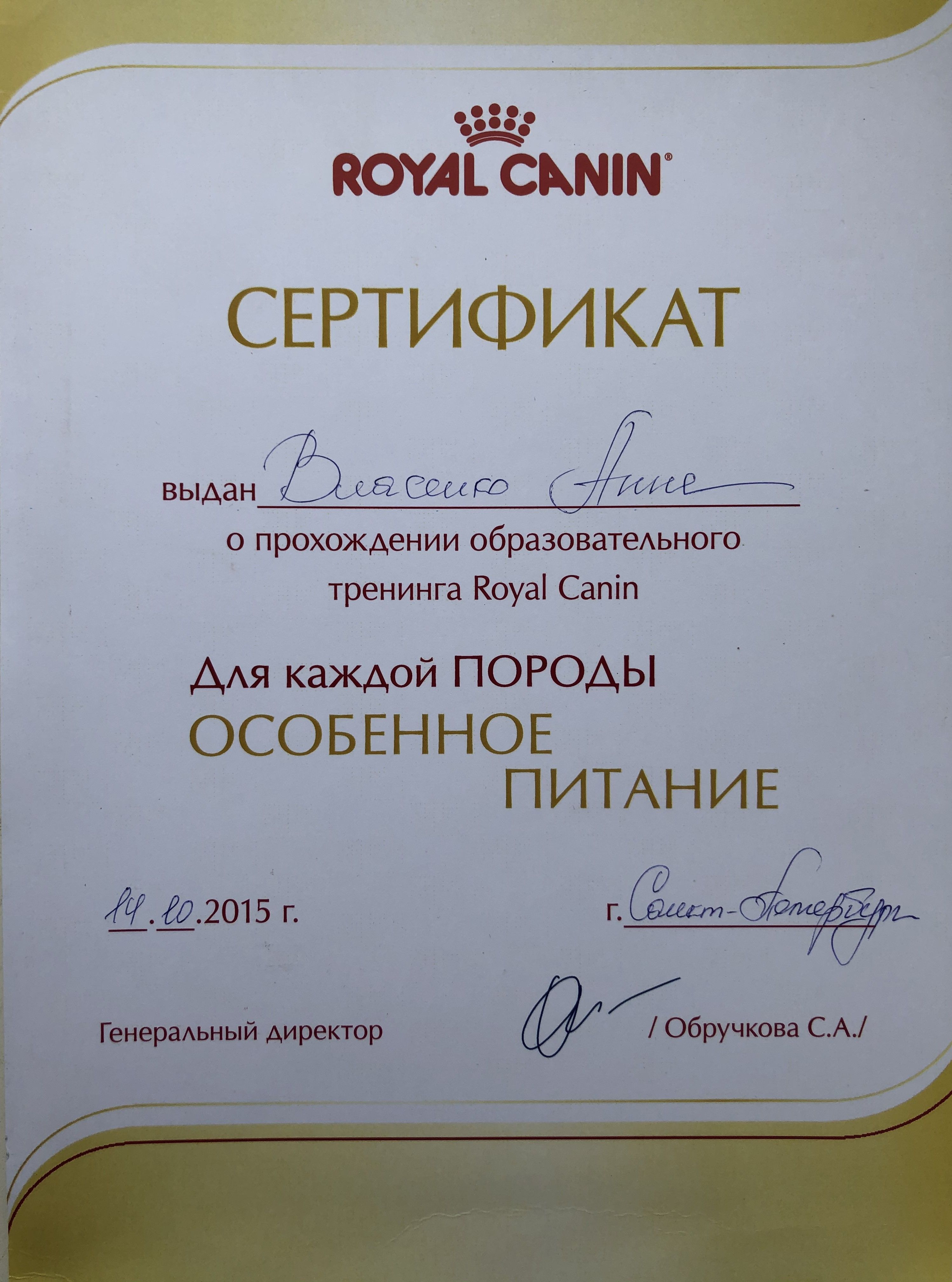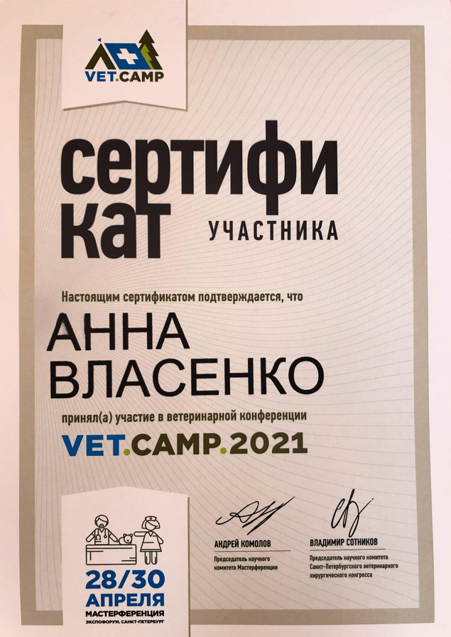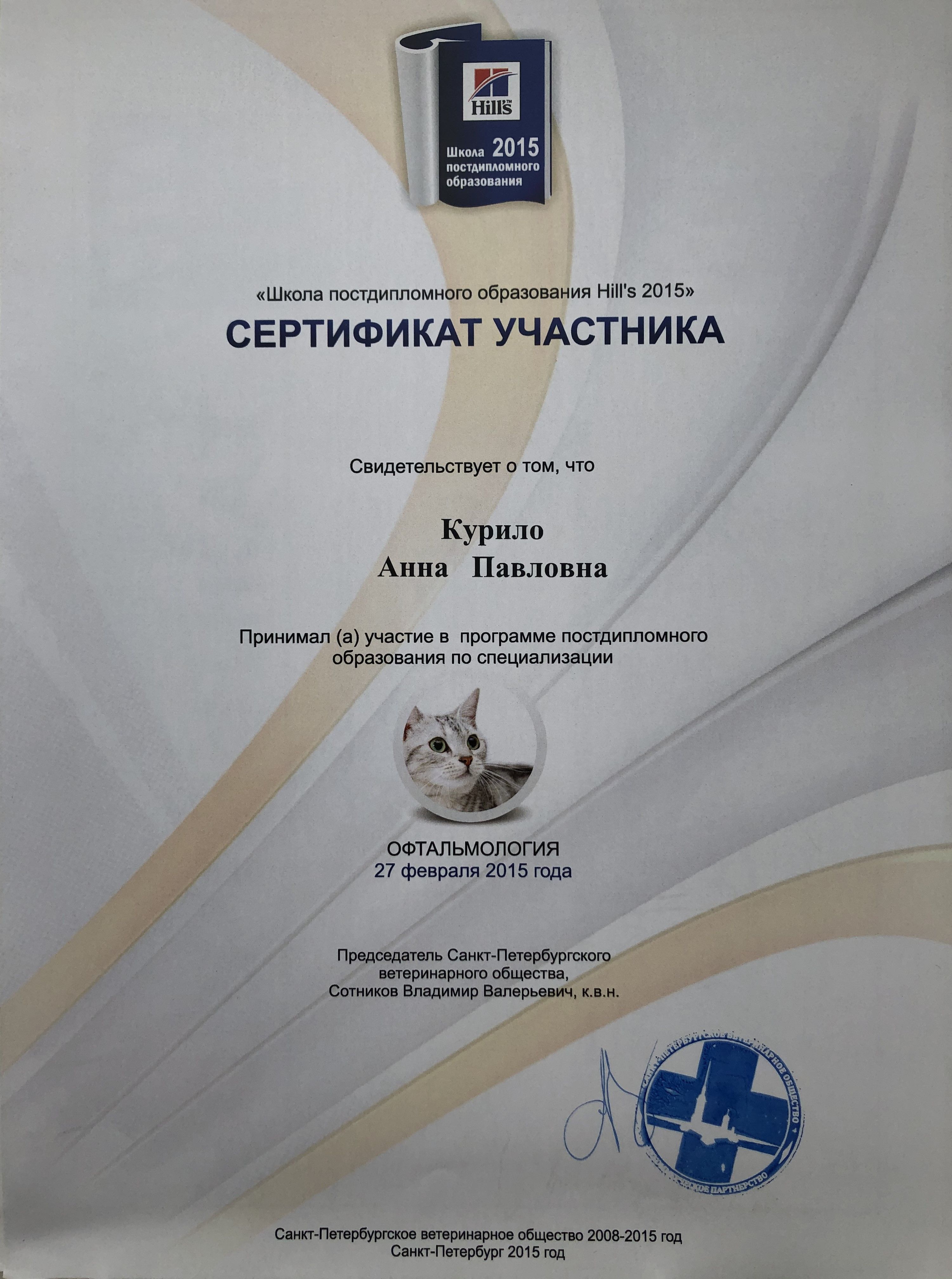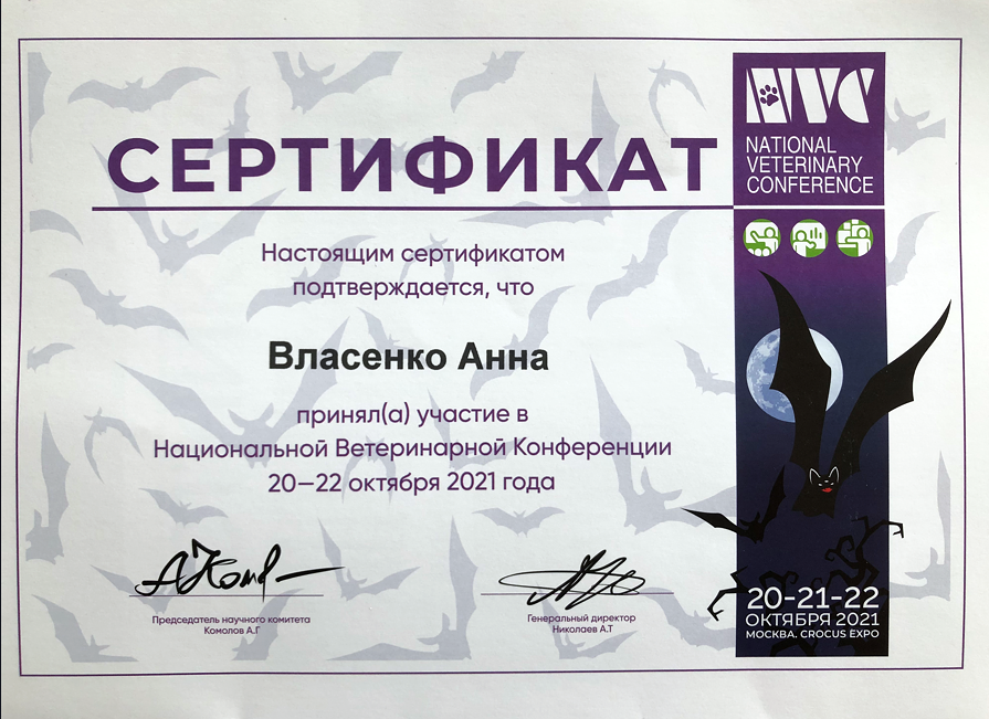 Образование: окончила СПБГАВМ в 2009 году (Диплом № ВСГ 3943194)