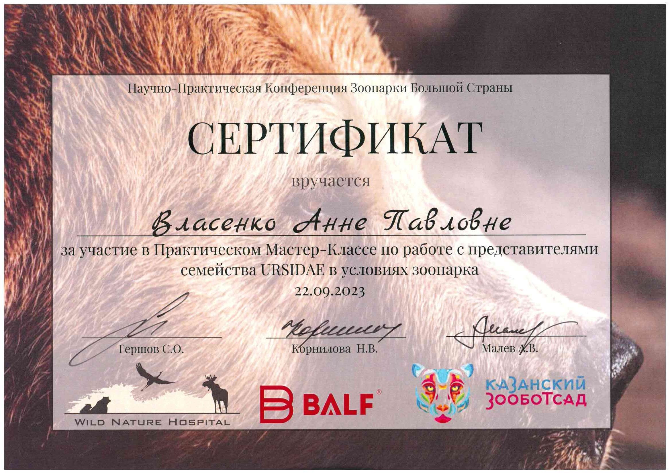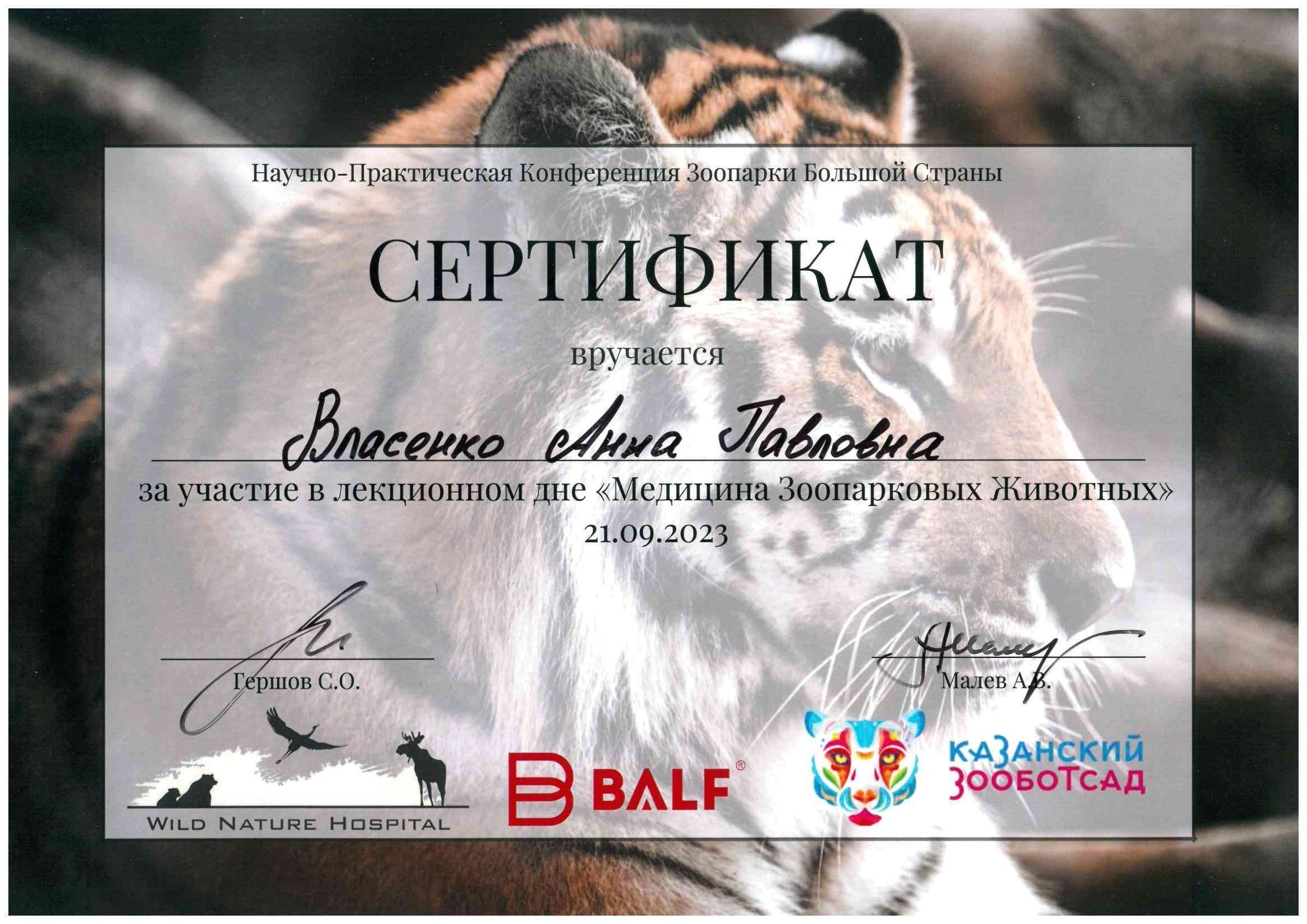 - Wild Nature Hospital "Мастер-класс по работе с крупными хищниками в условиях зоопарка", Казанский зоопарк, Казань, 2023 год