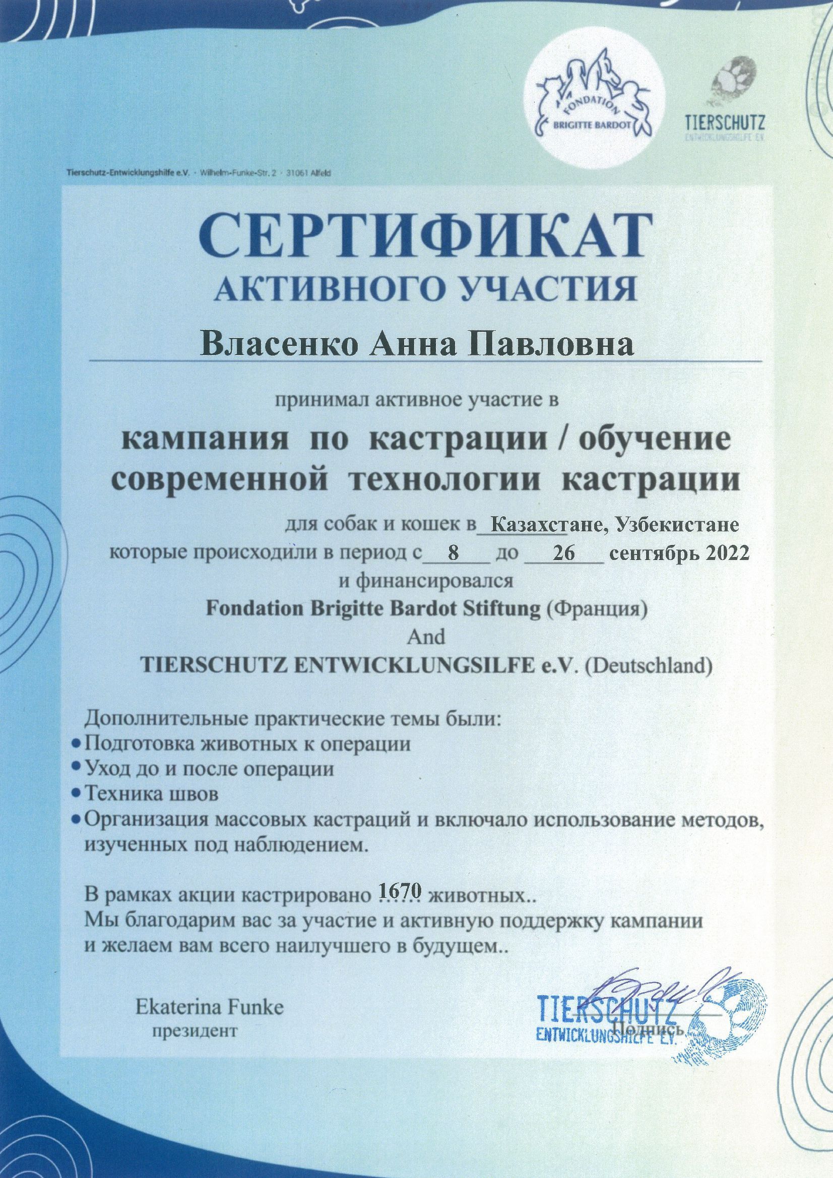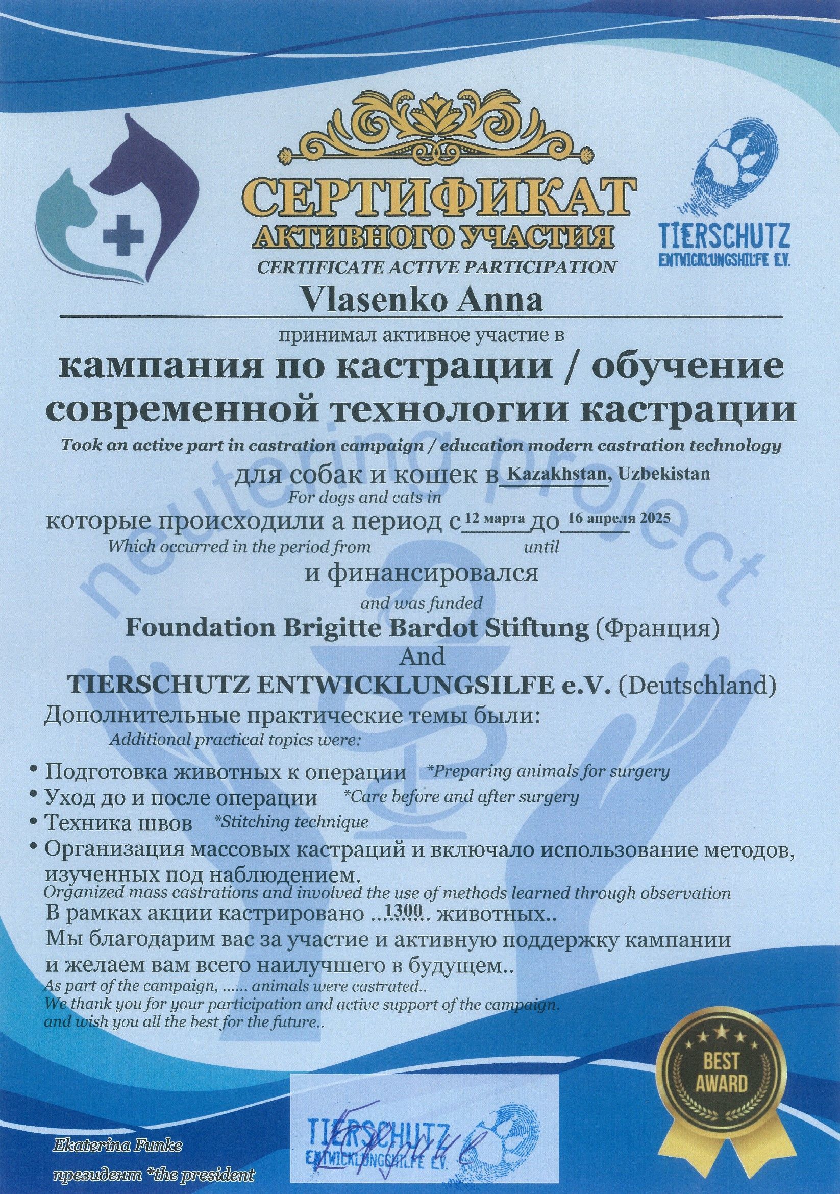 Врач-хирург международного фонда помощи животным BRIGITTE BARDOT и немецкого союза защиты животных TIERSCHUTZ.