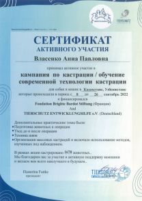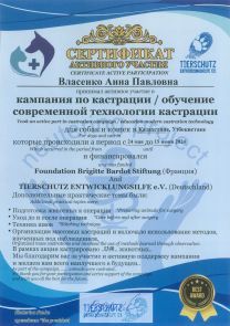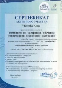 Ежегодное участие в акциях по массовой кастрации безнадзорных животных и обучению молодых специалистов, на базе ВУЗов, ветеринарных госпиталей и приютов стран Азии, на Кавказе и восточной части России, с 2022 год